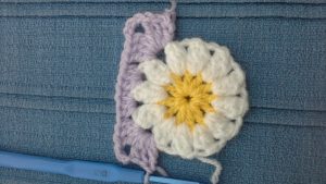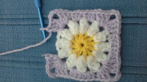 There are many daisy granny squares out on the interwebnet, not to mention the confusing USA v UK versions of stitches.  I am relatively new to crochet and can only do a few stitches, so can’t lay claim to copyright on any of this, however, this is me mashing a few of those patterns together making the most of a treble and half treble stitch!